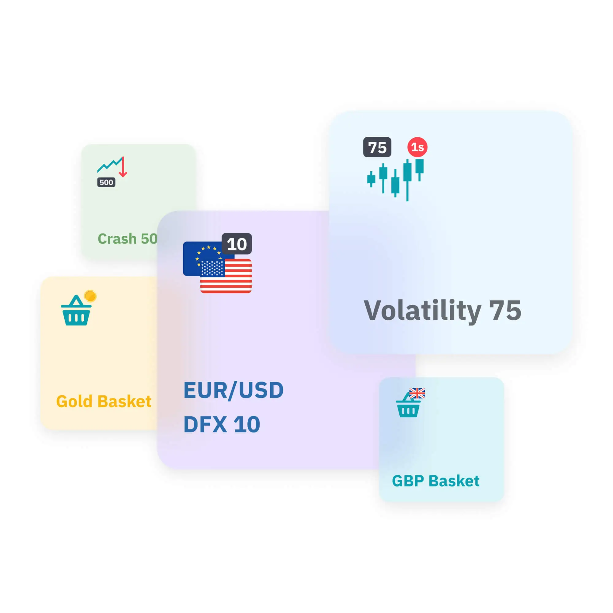 تداول مؤشرات Basket على Deriv، بما في ذلك Forex Basket التي تشمل (AUD, EUR, GBP, USD) وGold Basket، كل منها مقابل مجموعة من خمس عملات رئيسية بنفس الوزن.