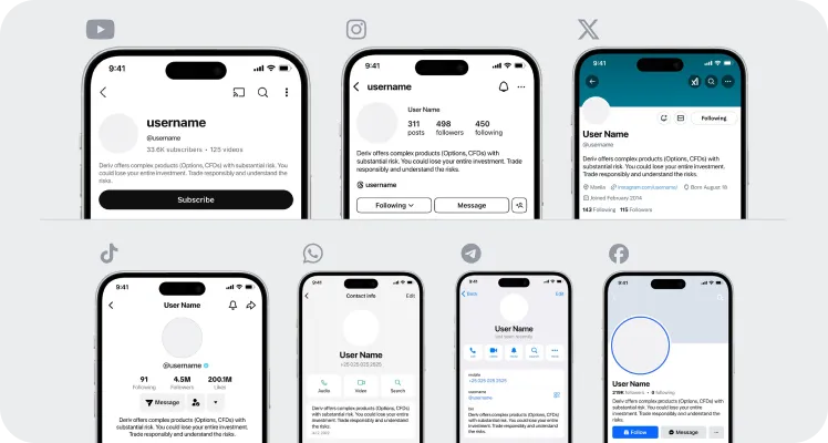 • Promote Deriv appropriately on legitimate social media platforms like YouTube, Facebook, Instagram, X, and Telegram.
